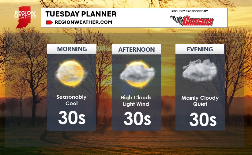 Happy Tuesday everyone! We’re a week away from Christmas Eve…crazy! We’ll catch a break from an active weather pattern across the Great Lakes today with lingering low clouds near the lake and sun with high cloudiness elsewhere. Expect seasonable temps today with upper 30s to even low 40s this afternoon with light wind. Clouds increase tonight with a few snow showers possible into our Wednesday as our next system zips through the Region.