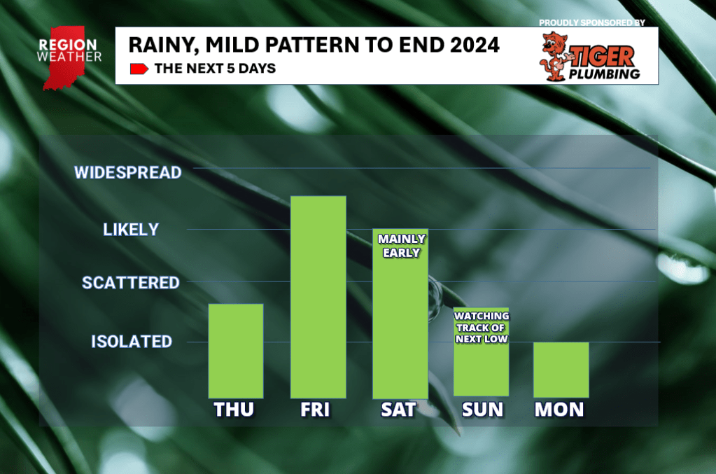 The fog, low clouds, and occasional drizzle/light rain will continue today as we remain in a rather stagnant pattern right now. That will begin to change tomorrow as our next wave of low pressure heads towards the Region. This low will bring a decent round of rain Friday into Friday night before exiting to the northeast Saturday. Another low needs to be watched Sunday for additional rain potential–right now it looks to pass JUST southeast of us, but a slight jog in our direction will bring more rain Sunday and Monday. Colder air still looks to rush in for the beginning of 2025!