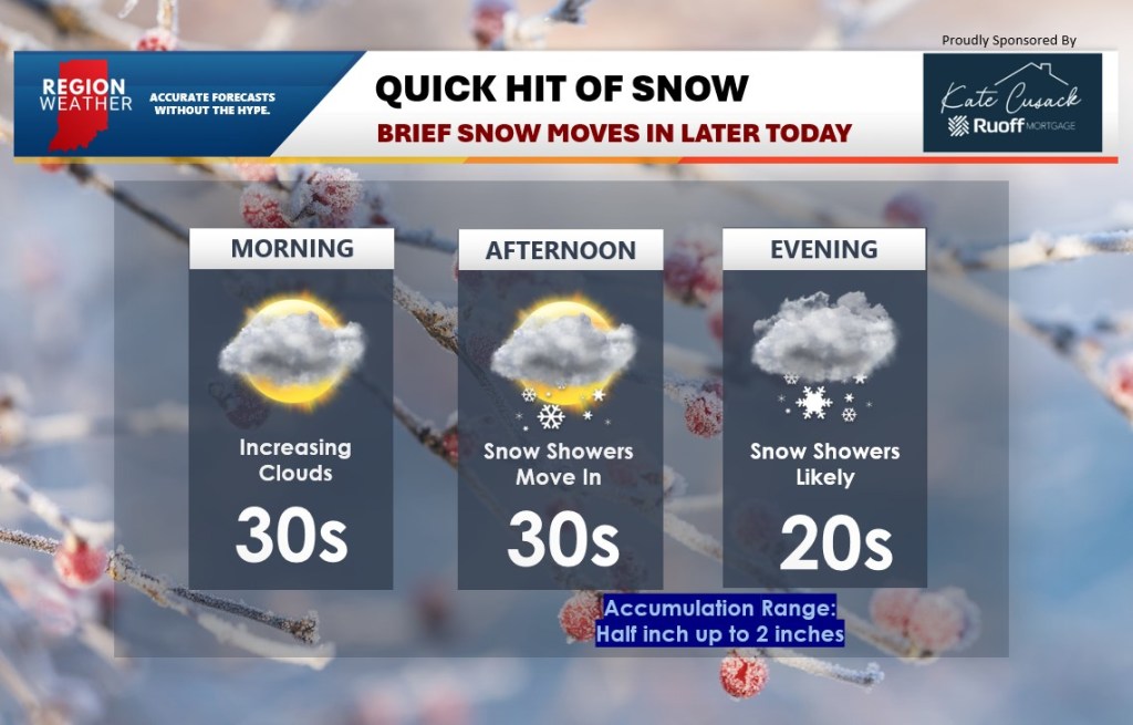 A weak clipper system will zip through the Region later this afternoon into the evening bringing a quick hit of snow. We’re not expecting much with this one–a half inch up to 2 inches is possible depending on where any banding sets up within the system. Impacts should remain minimal on treated roadways, but untreated roads will get a bit slick later today. This snow quickly clears out tonight with temps in the 20s.