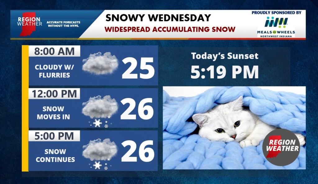 Good Wednesday morning everyone! Snow is still a few hours out but we’re expecting it to overspread the Region late this morning into the midday hours with snow continuing through the afternoon. The snow will likely become more scattered later this evening. We’re looking at 3-5 inches of snow with isolated higher amounts possible by the time the day is out. Roads will become tricky to navigate this afternoon into the evening so allow extra time if you’re heading out. Some lingering lake effect snow will swing through tonight into early tomorrow before we spend the rest of our Thursday with the return of some sunshine. Tomorrow will be colder with steady or slowly falling temps through the 20s.