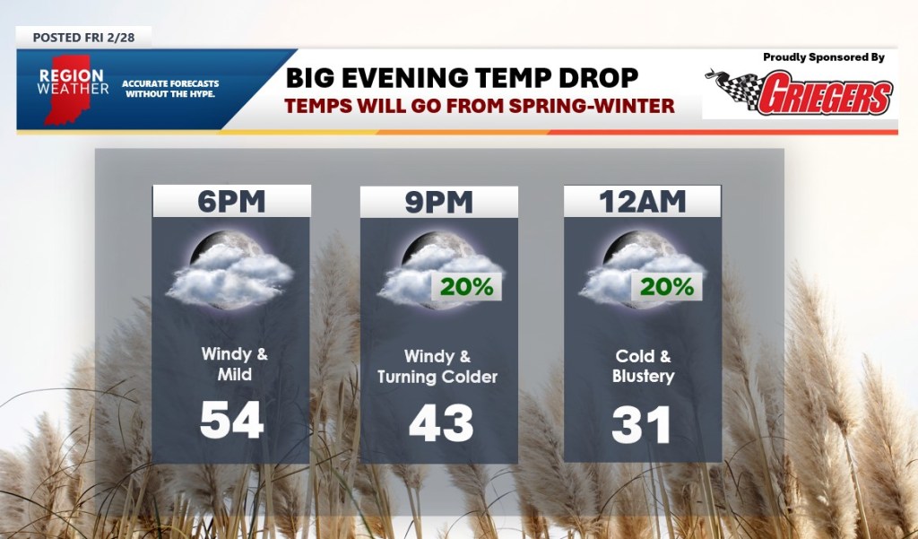 Just a heads up for all those heading out this evening–we have a big temp drop on the way as we go from the spring-like warmth to winter cold once again. We’ll fall from the 50s into the 20s in a 6-8 hour stretch as our wind shifts and colder air blows in for the upcoming weekend. Can’t rule out a passing shower or even a few snow showers overnight as the lake begins to get involved.