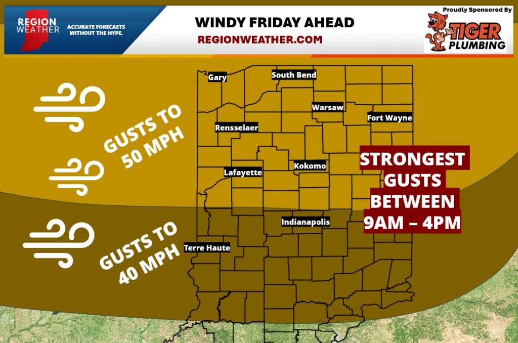 First of all, Happy Friday! A compact, but powerful area of low pressure will swing through the Great Lakes today bringing a widespread zone of strong, gusty winds. We’ll be right in the middle of that with gusts to 50 mph later this morning through early afternoon. We’ll remain windy this evening, but the strongest winds will be this morning through the afternoon. This wind is going to help send our temps soaring into the upper 50s to near 60 today!