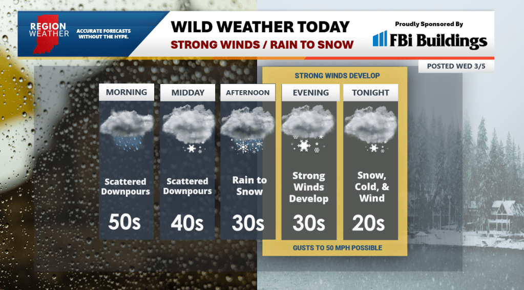 We’re at the top of the rollercoaster this morning with temps in the upper 40s and low 50s. Buckle up! Our powerful low pressure system is overhead and will move off to the northeast today bringing the backside of this entire system featuring strong winds, tanking temps, and rain that changes to snow. It will feel much different around here for that evening commute vs our morning trip!