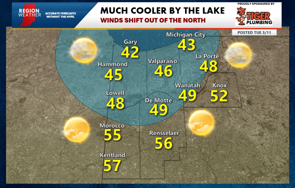 Good Tuesday morning everyone! The wind direction is everything this time of year and today it will make a big difference with our temps. A cold front will settle south across the Region this morning turning our winds out of the north once it moves through. This will result in temps that tumble today, especially near the lake with 50s quickly turning into 40s later this morning through the afternoon. Our southernmost locations will hang on to the spring-like air this afternoon! Lake cooling will take place again tomorrow but it won’t reach nearly as far inland.