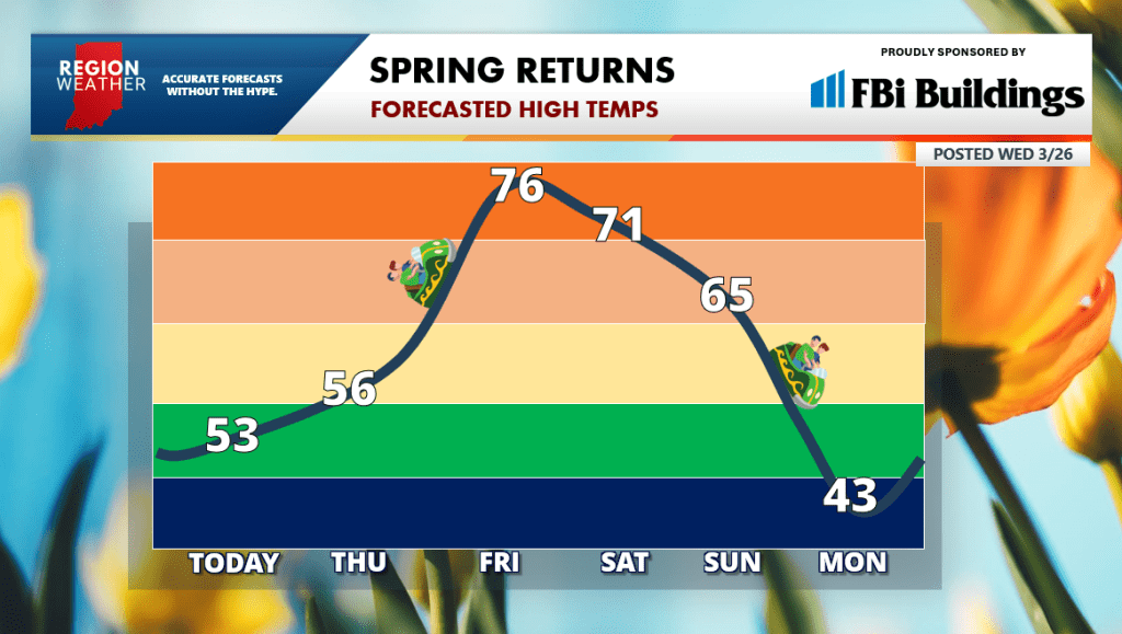 Happy Wednesday! Temps will head back close to average today and tomorrow before a strong warm front moves through the Region on Friday. Showers and storms are possible Friday as the front moves through–but once it’s through…you’ll know. Temps will surge well into the 70s by Friday afternoon through your Friday evening plans. Showers and storms will return this weekend–particularly late Saturday into Sunday as the cold front portion of this system moves through–temps will tank just as fast as they rose later Sunday into Sunday night.