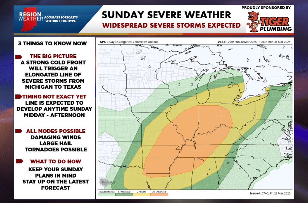 Hi everyone–just an early heads up as we begin to plan out our weekend and more specifically our Sunday. Signs continue to point towards a widespread threat for severe storms on Sunday from Michigan down through Texas and the Deep South. An expansive line of storms is expected to develop sometime Sunday midday-early afternoon along a strong frontal boundary working southeast. This isn’t a guarantee locally and the highest threat will be down towards the Tennessee Valley–but as we discussed in our broadcast, we have good dynamics and the atmosphere will be ready to go Sunday. For now, enjoy the beautiful Friday evening we have ahead and stay tuned to future forecasts…don’t let this be the last forecast you read until Sunday as updates will come.