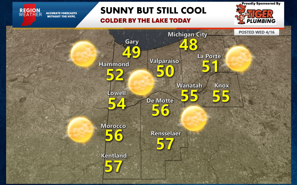 Happy Wednesday everyone–we’re getting closer to that weekend and closer to a warm up in the forecast. Today will be a comfortably cool transition day with highs pushing well into the 50s inland. The wind off the lake will create another day of chilly temps in the 40s and low 50s close to the lake. Sunshine prevails all day with just a few high clouds. Enjoy!