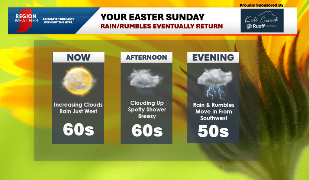 Happy Easter everyone! It’s been a great morning so far and much of the day will remain dry. We have an area of rain JUST to our west that may spread a quick shower into our western counties–otherwise we’ll just focus on becoming cloudy today with a spotty shower or two during the afternoon. The bulk of the rain moves in tonight. A widespread severe threat exists with this system in Missouri and southwestern Illinois–but it won’t translate to us. Rain and rumbles will move through very late this evening into tonight and little to no severe weather is expected–just some good rain.