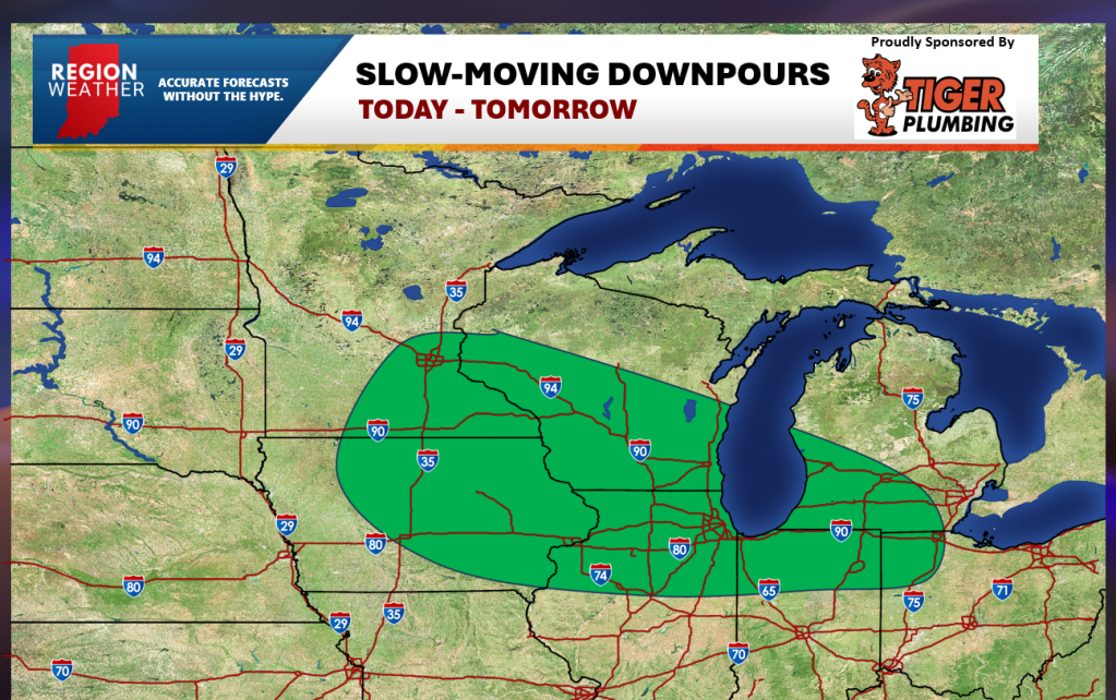 A frontal boundary will stretch from Iowa through Michigan later today bringing scattered slow-moving downpours through portions of the Region, especially tonight. While some thunder is possible, we’re not expecting any severe weather from this. There will be plenty of dry hours in between, but rain will stay in the forecast through the day tomorrow before we catch a break later Wednesday into Thursday. Temps will stay nice and warm with highs in the 70s the next three days!