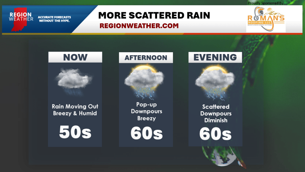 An area of low pressure that brought a good soaking rain through overnight into the early morning hours will clear out and give way to more pop-up downpours and a few rumbles of thunder today. Temps will rise into the upper 60s and combined with the humidity we should have no problem cranking out some efficient rainfall out of anything that develops. This low pressure will bring additional rain chances over the next few days as it will be slow to clear.