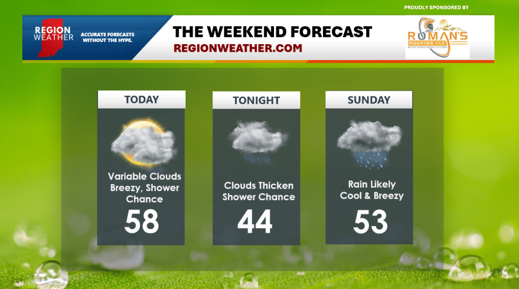 Good morning to all our early-risers on this Saturday morning! Even if you’re a late rise, you deserve a good morning too and congrats on making it to the weekend–we have some rain in the forecast this weekend, but most of our Saturday will be on the drier side. The area of low pressure we’ve been talking about that will get “stuck” will be rotating to our south today, so most of the rain will be downstate. We’ll enjoy clouds and some sun with a breezy day. Highs will push into the upper 50s and perhaps low 60s if we get enough sun in spots. Tonight clouds will thicken up and the low will rotate our way Sunday bringing waves of showers and a chilly, breezy day with highs in the low 50s with the clouds and rain. We are not anticipating any severe weather or anything like that this weekend–just a cool, damp Sunday. We will not be chatting on our Sunday Evening Region Weather LIVE as we have an event–but we’ll pick it right back up next week! Enjoy the weekend everyone!