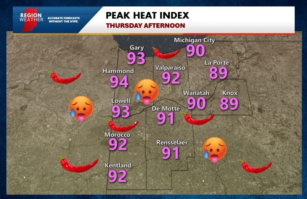 Get ready for some late Spring heat around here on Thursday! Sunshine, a gusty wind, and humidity will combine to make it feel like summer around the Region. Highs will push into the upper 80s to near 90. Heat indices will likely push into the low 90s during the afternoon! You know the drill, it’s just been awhile–stay hydrated etc. The record high temp for Thursday is 89 officially at the Porter County Airport–we’ll come close.