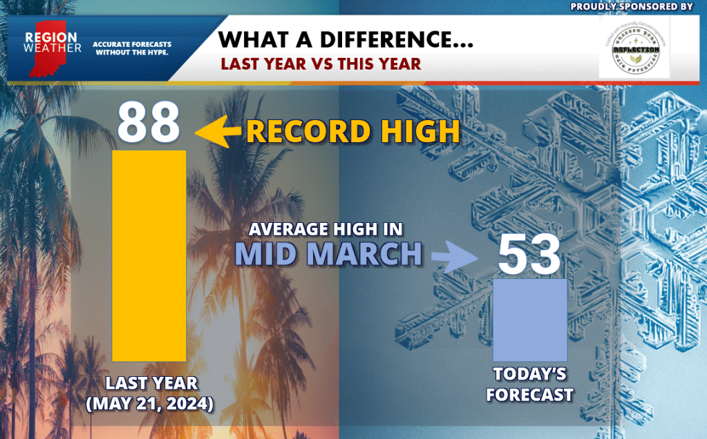 My goodness, what a difference a year makes! Last year on May 21st we were in the pool, barbequing, and cranking our AC’s as we set a new record high at 88 at the Porter County Airport! This year we’re in our sweatpants, making hot soup, and cranking our heat back up! Temps today won’t go anywhere as our wind shifts off the lake keeping us 20+ degrees below average.
