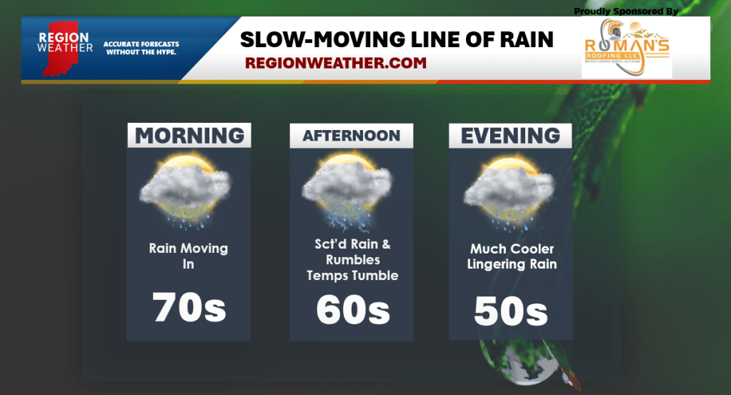 Speaking of heat up–our temps are warmest here this morning. A wind shift by early afternoon will bring in much cooler temps from the lake this afternoon into the evening. Temps will head from the 70s this morning into the 60s this afternoon and even upper 50s near the lake. Bring a jacket if you’re heading out today! Rain chances will begin to back off overnight into early Thursday as this front settles to the south.