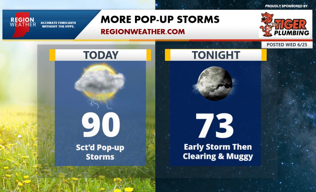 Welcome to Florida, I mean Indiana. Also, happy Wednesday! We’ll be dealing with more pop-up storms today with hot and humid conditions. Temps will make a run at 90 again this afternoon and we can expect this trend to continue through the end of the week and into the weekend!