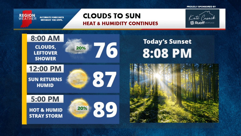 Happy Tuesday! We’re watching a decaying complex of storms to our west once again this morning and we’ll get some cloud cover off of this and a leftover shower chance. Otherwise, the sunshine breaks out and we’ll have another hot and steamy one with highs pushing 90. Storm chances ramp up tomorrow with the approach of our game-changing cold front!