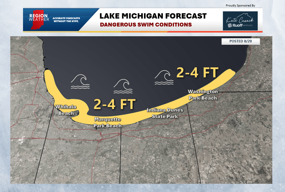 Rip current risks have been common along our Lake Michigan shores this summer–in particular any time we have a stronger northerly component to the wind. And you guessed it–we have that going for us today. Wave heights aren’t particularly high in the 2-4 foot category, but the rip currents are the issue, even for experienced swimmers. Water conditions will begin to improve by Friday.