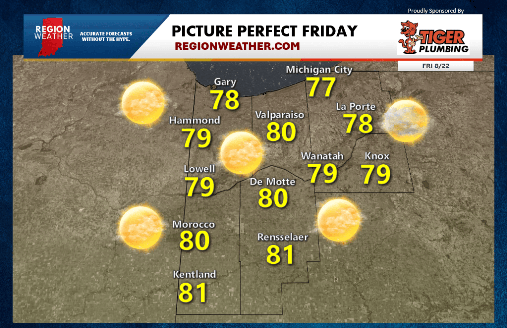 As if the Friday energy wasn’t enough–our weather will easily put you in a great mood today with manageable humidity, lots of sunshine, and comfortable temps in the upper 70s! The high school football season kicks off tonight as well with a beautiful night for football or whatever you may be getting into this evening. Enjoy!
