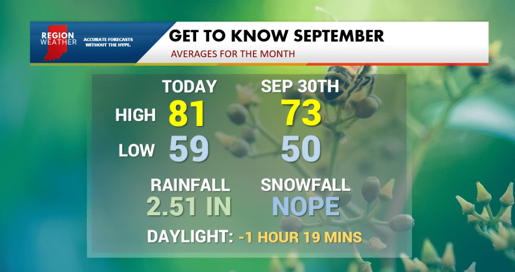 As always at the beginning of the month, we like to get to know where we are…and where we’re going climatologically. We know it cools down in September with our average highs and lows dropping a little less than 10 degrees. We get some rainfall in the month of September although dry spells are common with a continued relaxed pattern at times. The most noticeable feature during the month is that loss of daylight–this is the month you notice the shorter days. In addition to the cooler nights and warm days–the loss of daylight helps trigger our trees to produce those beautiful colors.
