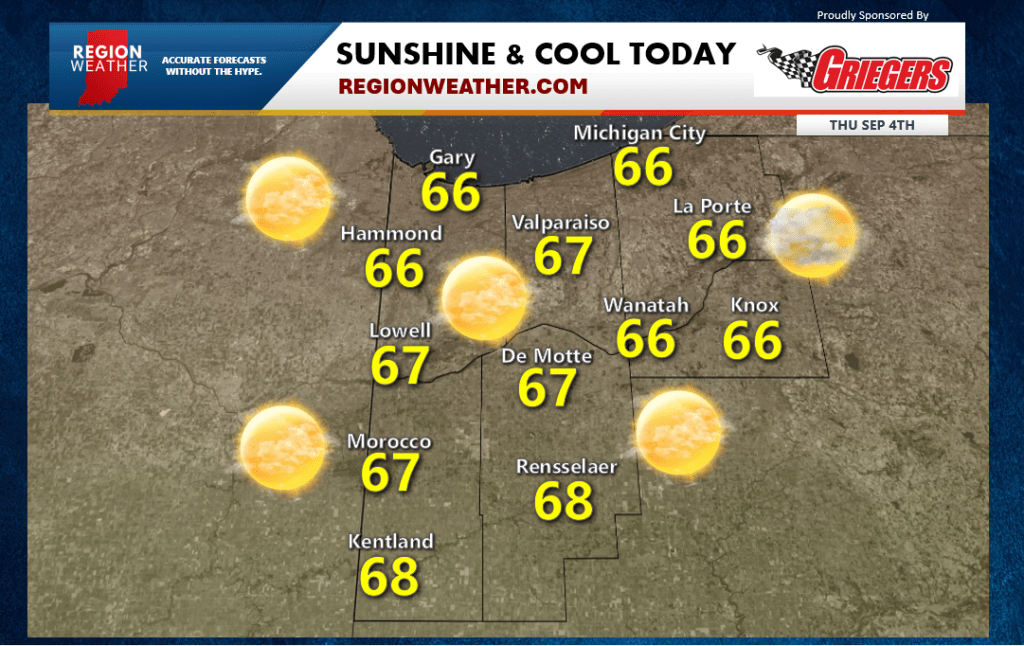 Let’s get our Thursday started! We have a beautiful day in store, albeit on the cooler side with highs hanging out in the upper 60s this afternoon. Our northerly wind is kicking up the waves on Lake Michigan–so not a good day to get into the water. A secondary will approach tonight into Friday kicking up our wind area-wide and reinforcing our cool air for the upcoming weekend!