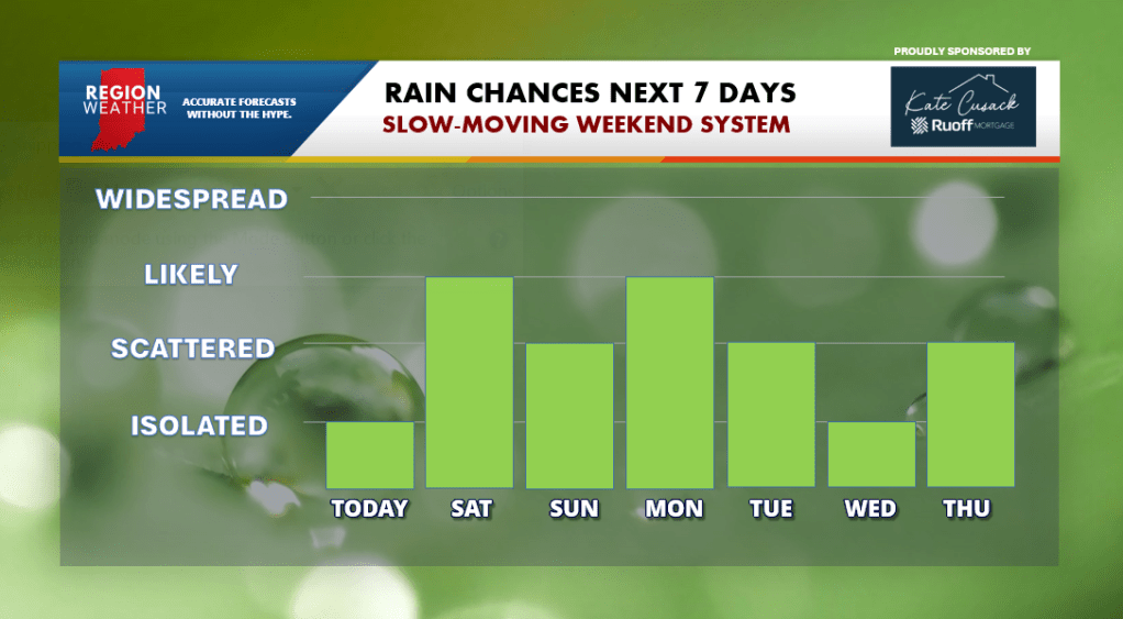 A slow-moving low pressure system is dragging its feet, but will finally swirl in here this weekend. An initial band of rain and rumbles will develop later today to our west and may squeak in here with leftover rain tonight. The better chance of rain and a few storms arrives tomorrow with periodic waves of rain all the way through next week. Keep in mind there will be lots of dry hours in between these waves of rain–but the overall pattern change will keep rain in the forecast!