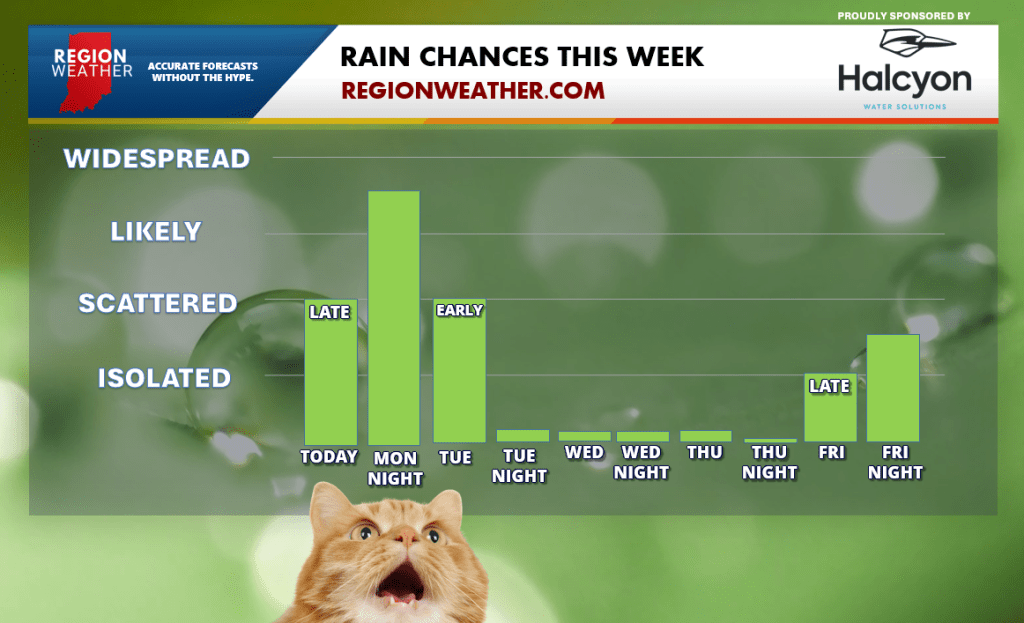 Weatherwise, look at us, talking about these rain chances again! We’ve come a long way. We’re not looking at a lot of rain–but the radar will be active late today into the overnight. We’re looking dry until a few pop ups show up late this afternoon into the evening. Our best shot at rain and a few rumbles arrives tonight into the first part of the day Tuesday. Another shot at a few passing showers exists later Friday. Still lots of dry time this week before another pattern shift arrives next week perhaps bringing us better shots at multiple days of rain.