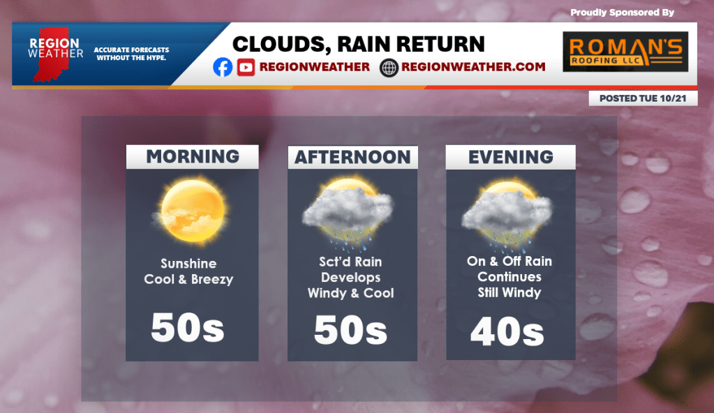 Good Tuesday morning everyone! We’re behind a cold front but awaiting the “swirling” portion of the system this morning. While we wait, we actually have a beautiful morning as we chatted about yesterday…but that will all change later today as the swirl arrives. Expect clouds to increase with a popcorn-like look to the radar as scattered downpours move through. Winds will be gusty–over 35mph at times, especially during any more organized showers. Temps will approach the mid to upper 50s before scaling back once the clouds and scattered rain arrives. Expect a damp, cool evening if you have plans. Well, even if you don’t it will still be a damp cool evening lol.
