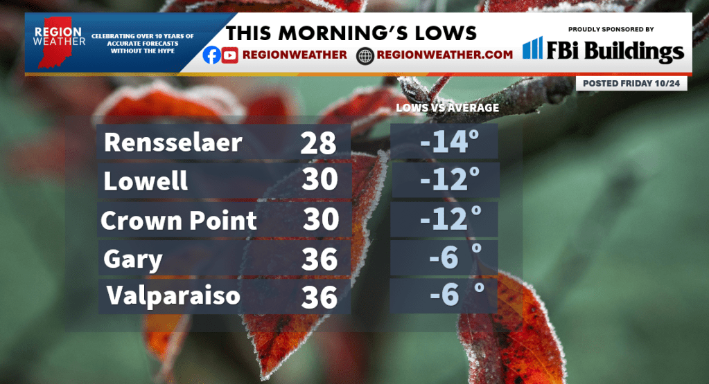Yikes! Our first freeze occurred for those of you away from the lake with numerous sites reporting 32 or below–even some upper 20s! Closer to the relatively warm lake, temps dropped into the mid and upper 30s. Another cold night is expected tonight into Saturday morning–but we’re still expecting it to be a degree or two higher.