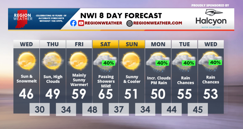 Happy Wednesday! A few quiet days ahead of us as that snow melts off quickly–should be gone by Saturday as temps soar into the upper 50s to mid 60s ahead of our next storm system. This system will zip through with clouds on Saturday and a few passing showers. We’ll cool down and dry out Sunday. Next week is still up in the air (pun intended) as models disagree on how the next series of storm systems go down–for now we’ll paint it with rain chances to start the week.