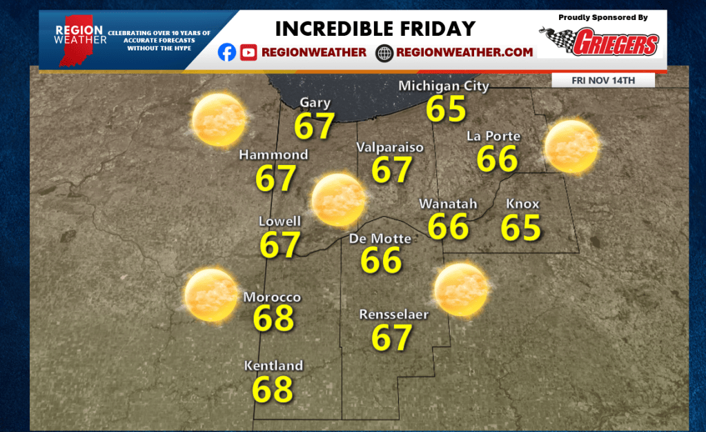 My goodness. Today’s forecast. It’s good enough that it’s Friday, but our weather does not get any better this time of year than what we’ll experience today. Make plans to get outside–upper 60s today with sunny skies. We’ll even stay mild this evening into tonight with lows only dropping into the 50s. What do you have planned today?
