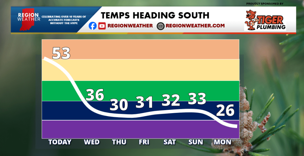 Good Tuesday morning! We have our active weather pattern with a lot coming at us weatherwise the next 6 days. Let’s start with our temp drop on the way. Our temps will head south tonight and will hold in the 30s for highs through the weekend. Nothing out of the ordinary here, but it will feel a lot different than our mild air we have now. Wind chill values with a howling wind tomorrow will drop into the 10s for much of the extended. Another shot of colder air is possible next week as we look to kick December off on a cold note!