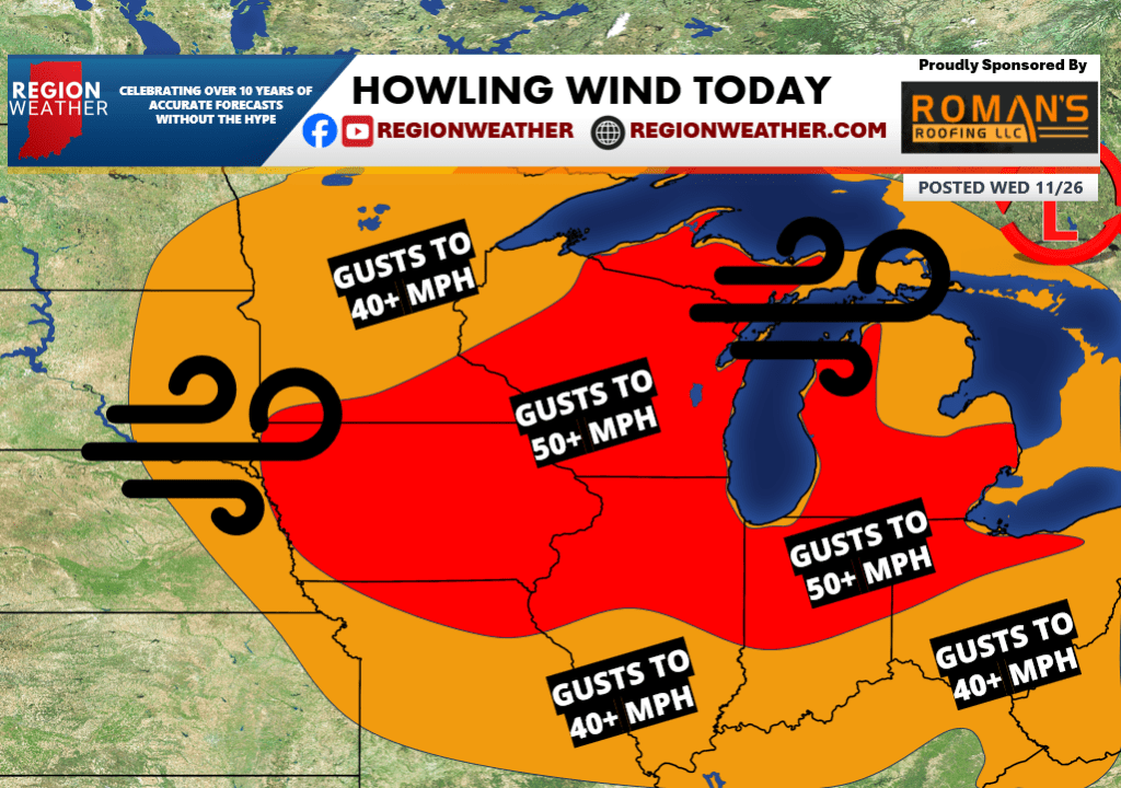 Much like your in-laws, this front didn’t come in quietly! Winds have been cranking overnight and will continue to howl today with gusts over 50 mph at times. Gusts over 60 are possible in portions of Wisconsin and coming off portions of the Great Lakes today as this low pressure continues to wrap up to our north. A lot of you are traveling today and this will be your biggest issue. Lake snow will become a bigger issue later today through Friday to our east–so if travel takes you on I-94 through Michigan or the Tollroad east towards South Bend, you’ll encounter lake effect snow through Friday. Drive safe everyone!