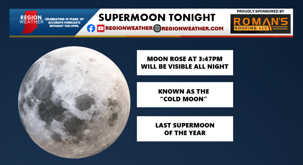 It’s rising in the eastern sky right now…and it’s BRIGHT. Say hello to our last supermoon of the year. Known as the “cold moon” and that’s rightfully so. My kids call it the “supper” moon, so it must be time to eat. Enjoy but stay warm! It will be with us all night and won’t set until 8:07am.