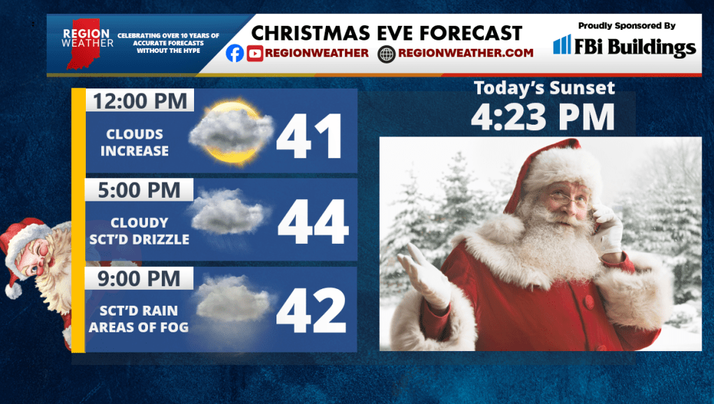 Santa’s going to need some help from Rudolph tonight as clouds, showers, and areas of fog roll into the Region. Not a bad start today though with increasing clouds and temps in the upper 30s and low 40s for all of your last minute errands! Clouds will thicken and a few showers/areas of drizzle will develop later today with the potential for fog development as Santa arrives in the Region. Don’t forget the milk and cookies and those carrots for the reindeer–they’ll be working hard tonight!