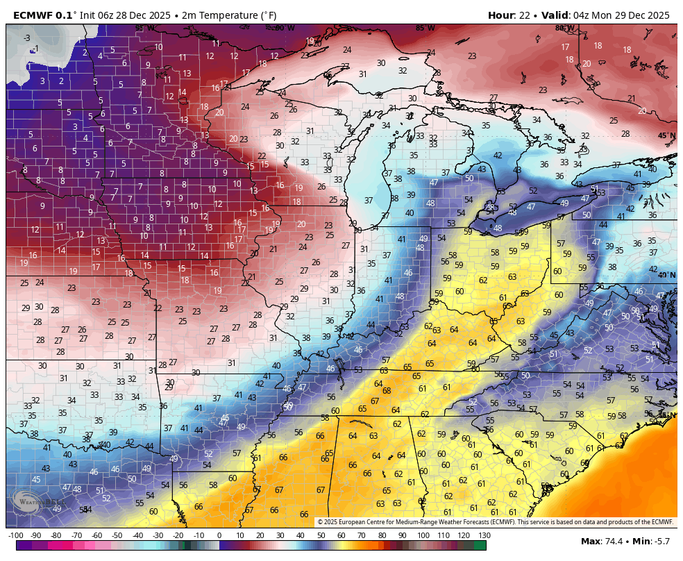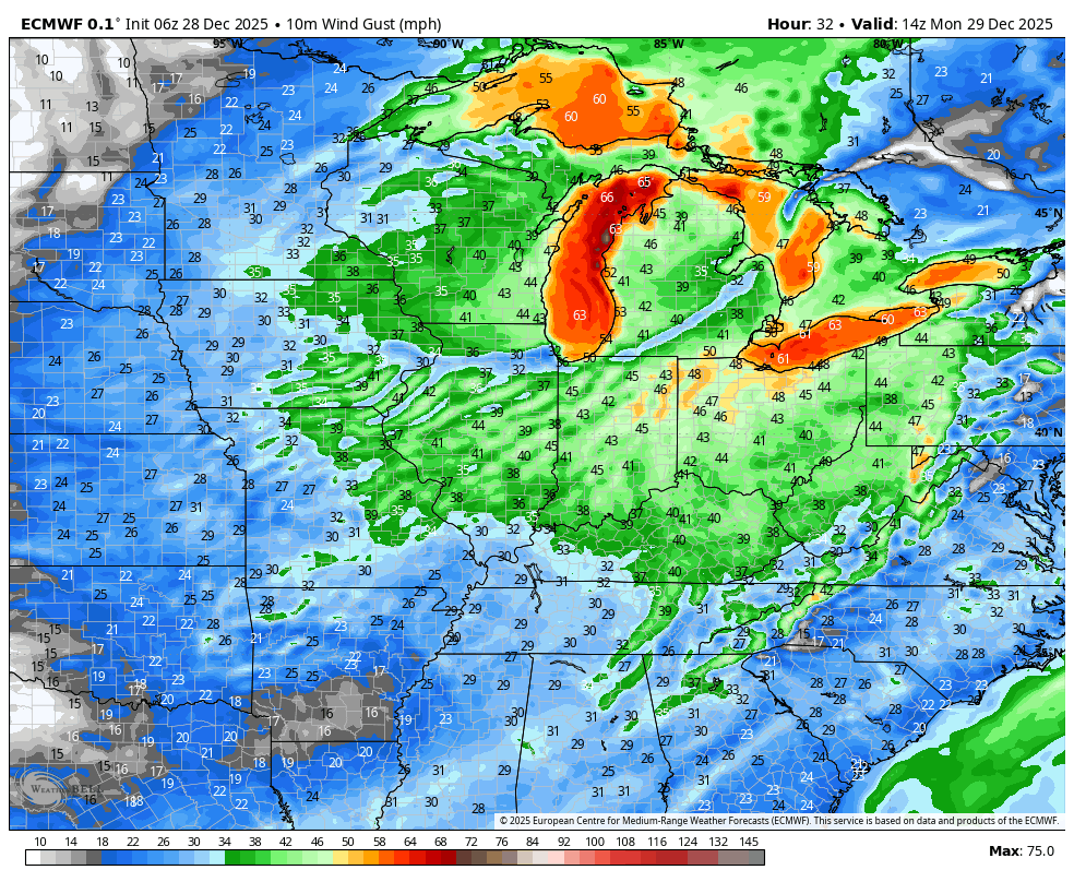 The wind is what you’ll notice as well. During the day it will be breezy out ahead of the front in the warm air, but as this low deepens, the wind will really ramp up once the front goes through with gusts over 50mph likely. Gusts could exceed 60-70mph in portions of the Great Lakes, especially out over open waters on the lakes themselves. Power outages are certainly possible.