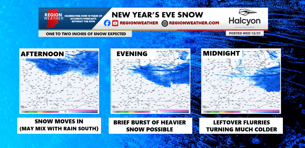 Happy NYE everyone! Whether you’re heading to the Pierogi Drop, or a ball drop here in the Region, we’ll have some snow flying around as our second clipper system in as many days moves through. Expect snow showers to develop late this morning through early afternoon as our system moves in from the northwest. We could see some rain mixing in at first the further south you’re located, but as cold air takes over, we’ll all experience snow as we’re getting set for our NYE plans. Snow showers will continue through our evening with a potential quick burst of heavier snow as a cold front moves through sometime between 5-8pm. We’re not expecting a lot of snow from this one either, but 1-2 inches looks common by the time 2026 hits. As we learned last evening, it doesn’t take much for roads to become slick if they’re untreated, so take it easy if you’re driving tonight. Also of note, our temps will drop pretty quickly behind this front. We’ll reach the low 30s during the afternoon before we quickly drop through the 20s into the 10s this evening into the overnight.