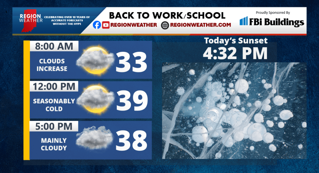 Good Monday morning everyone! We have a nice quiet day weatherwise as we get back into our routines after two weeks of holiday time. Stay strong parents! Clouds will thicken up today with highs pushing into the low 40s. Expect cloudy skies with the potential for some fog tonight with lows in the mid 30s. We’ll have a few showers around for that Tuesday morning rush hour, otherwise this system will pass through without much fanfare!