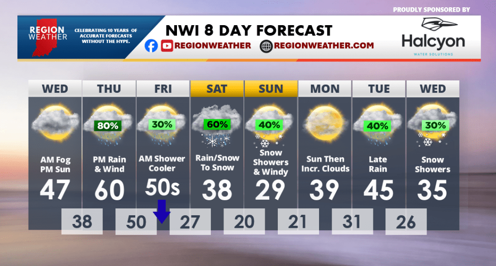 Good Wednesday morning everyone! Morning fog will give way to sunshine today as high temps push the mid to upper 40s. Tomorrow will feature warming temps all the way through the evening when we should hit 60! This will come with rain and wind as a cold front moves through the Region.