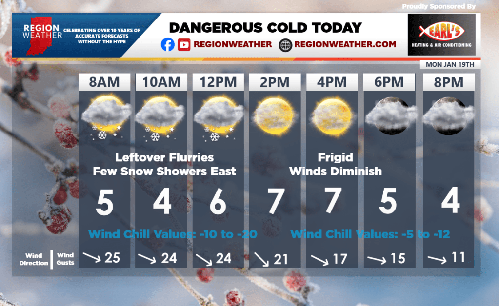 Good Monday morning to our Region Weather email family. We have a layer of ice on roadways from last night’s snow, the compaction from traffic, and the frigid temps. Very messy overnight so be careful if you’re heading out. The arctic air has arrived and we’re icy and frigid this morning with little improvement expected through the day. Our gusty morning winds will begin to back off later today, so there’s THAT, but our wind chill values will remain in the -5 to -15 degree range even with our afternoon sunshine. We’ll improve slightly tomorrow afternoon after another frigid start, but more cold air is on the way later this week into the upcoming weekend as we talked about in our broadcast last night. Just your daily reminder that Spring is 61 days away!