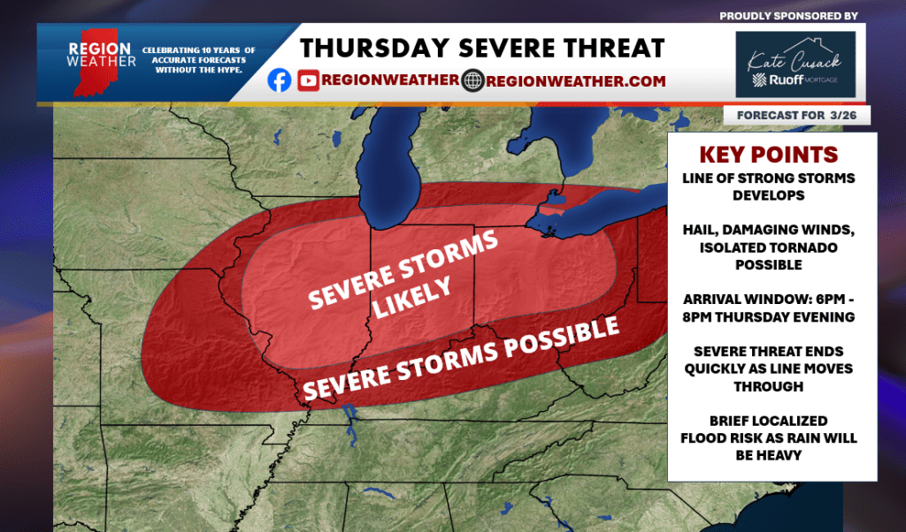 Then our attention turns towards our severe weather threat tomorrow. Our next cold front will approach from the northwest during the day Thursday and it carries with it a severe threat and a dramatic temperature drop. Storms are expected to develop in a line just to our northwest sometime around the evening rush hour. They would then surge through the Region tomorrow evening as cold air rushes in at the same time. Out ahead of this we’ll enjoy a summer-like day with highs pushing well into the 70s if not into the low 80s in spots! We’ll keep you updated on our storm threat–see the details in our graphic below.