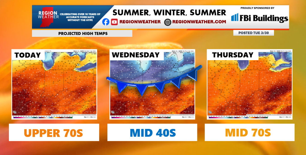 Good Tuesday morning everyone! Showers and storms will be around today (we’ll have to watch for a few stronger storms) but even more dramatic will be our temps the next 3 days. Expect another warm day today with highs in the 70s. Tomorrow Winter returns. It will be gross. And then a warm front surges north bringing summer back to the Region on Thursday. Just wild.