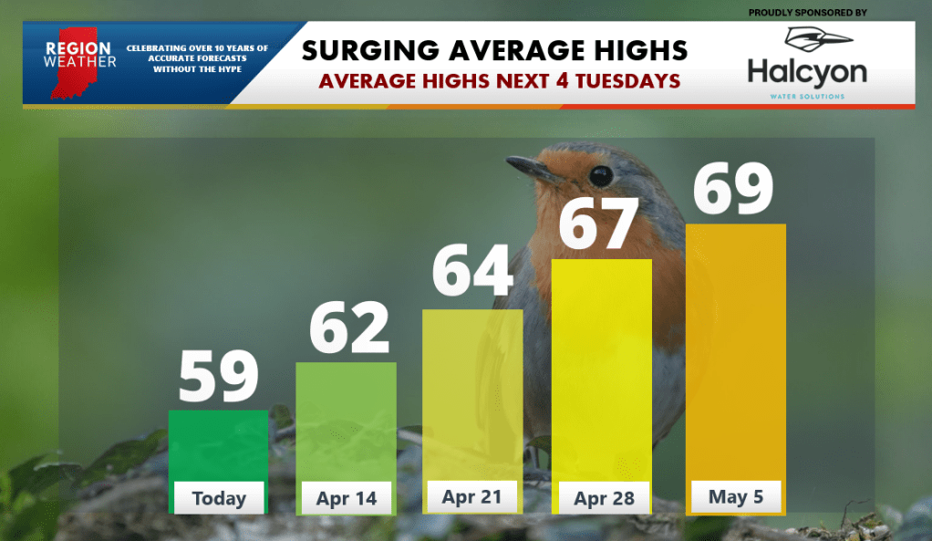 Our average highs are rapidly warming–even when we get colder days like today. Take a look at average highs the next 4 Tuesdays. 70s aren’t far off!