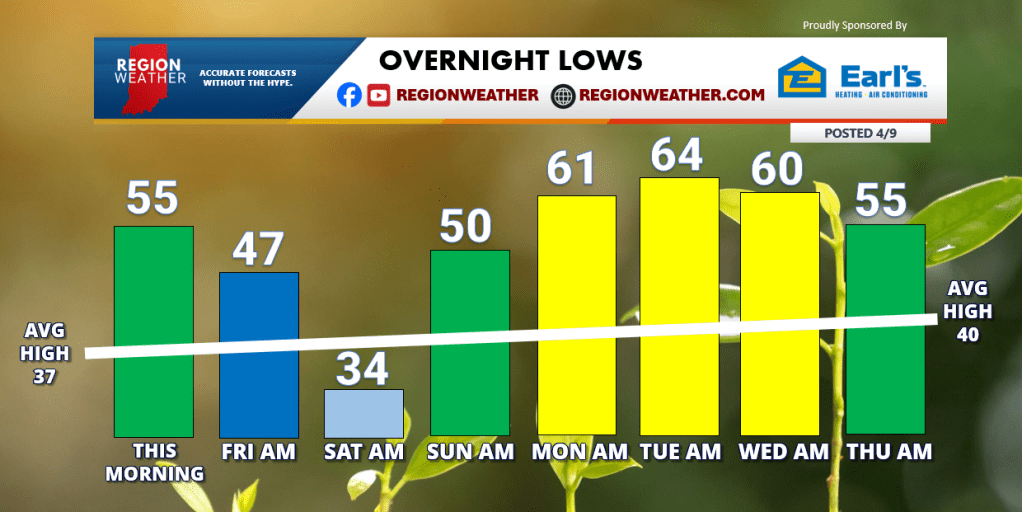 Don’t. You’re going to get that itch, especially next week when we have multiple warm, almost summer-like days in a row. But don’t. Most perennials and even the grass in our lawns prefers overnight lows that stay above 50 degrees–and while we’ll be there for much of next week (helping things to green up!), our average lows are still well below that mark! Here are our forecasted overnight lows the next 7 days!