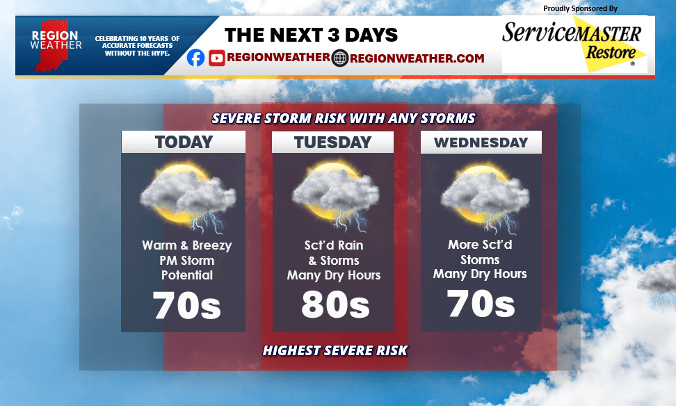 Good Monday morning everyone! We have warmer air and higher humidity–feels great right? This always comes at a price this time of year with storm chances galore in our forecast…but most hours will be absolutely fine and dry. With our atmosphere, any storms that do develop could quickly go severe, so we’ll need to be watchful later this evening and then tomorrow and Wednesday.