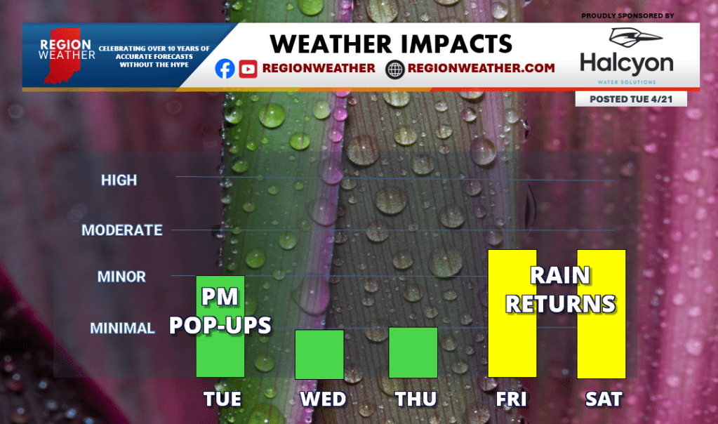 A frontal boundary will sag south across the Region later today bringing increasing clouds and pop-up showers and a few rumbles late in the day. Overall our impacts will remain low with some rain expected to continue overnight. Our higher impacts this week will be with the arrival of a more organized front with rain and rumbles Friday into early Saturday.