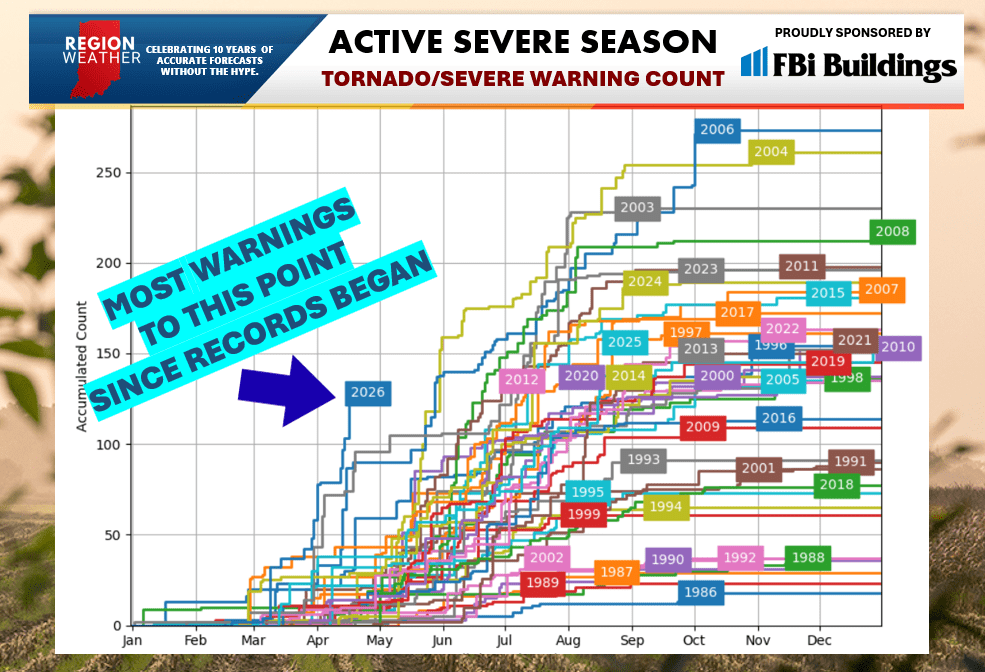 If you think it’s been quite the severe weather season so far–you’re right. Take a look at the tornado and severe thunderstorm warnings issued by our local NWS office so far this year. We’ve had more tornado warnings and severe thunderstorm warnings issued this year than any other year on record to this point dating back to the 1980s! We are FAR above any other year at this point. Our most active year was 2006 and we’re almost halfway to the entire 2006 total with 8 months to go. Yikes!