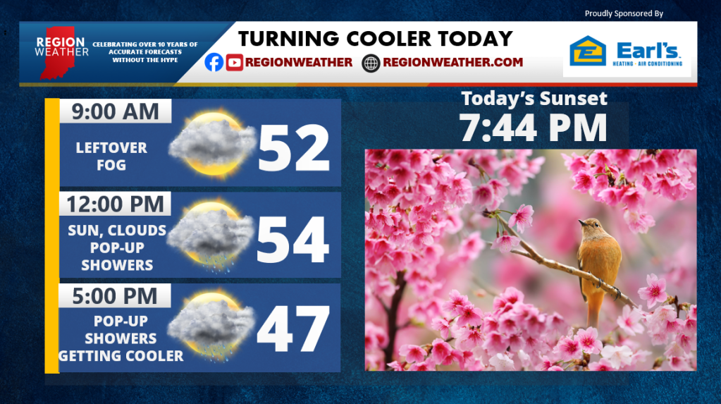 Good Wednesday morning everyone! An area of low pressure will move to the east of us bringing a gusty wind off the lake for much of the day. The result will be temps that begin to fall this afternoon from the 50s to the 40s. While much of the day looks dry, we’ll have pop-up shower risks as the cooler air moves in aloft. And how about our sunset time? Approaching 8pm 🙂 Enjoy your day!